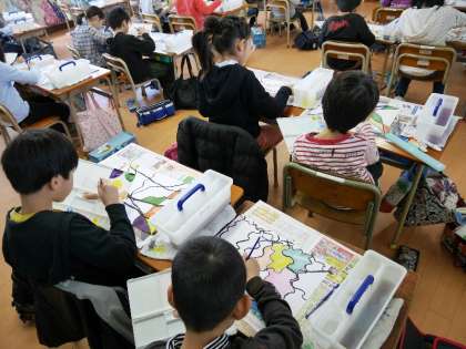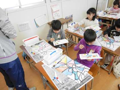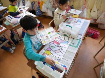 2年生がステンドグラスのようにガラスを描いていました。カラフルでていねいに塗ってしあげていました。