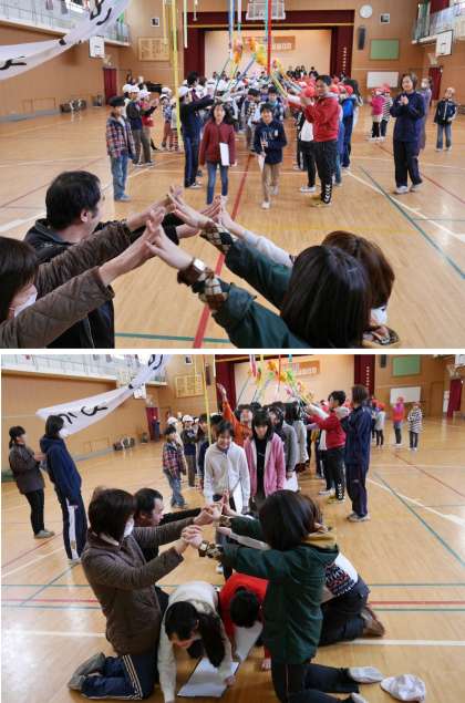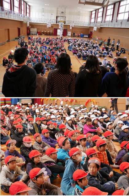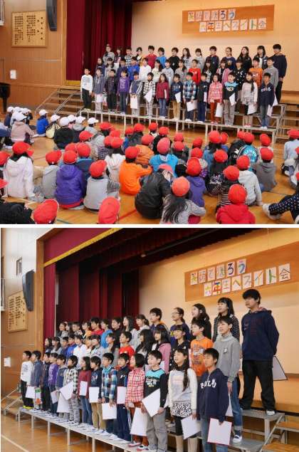 最後に6年生がお祝いの会をひらいてもらったお礼に、心をころて歌を歌ってくれました。歌は「千の風になって」の替え歌です。5年生がつくる花道をとおって退場しました。入口には6年担任が手をあわせて作ったちいさな花道をくぐって退場しました。