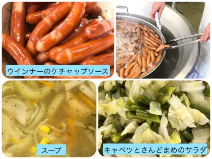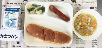 今日の献立は、ウインナーのケチャップソース・スープ・キャベツとさんどまめのサラダ・おさつパン・牛乳でした。