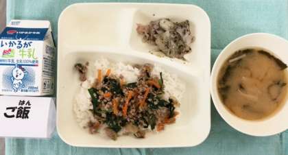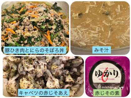 今日の献立は、豚ひき肉とにらのそぼろ丼・みそ汁・キャベツの赤じそあえ・牛乳でした。
