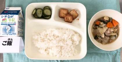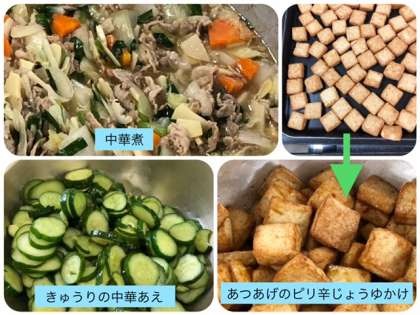 今日の献立は、中華煮・あつあげのピリ辛じょうゆかけ・きゅうりの中華あえ・ごはん・牛乳でした。