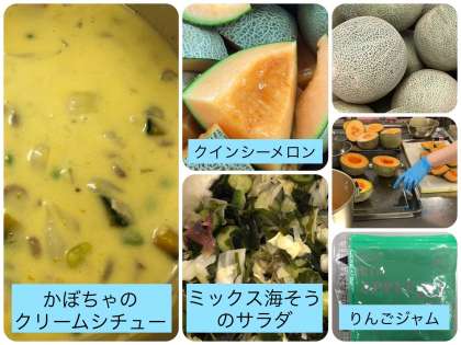 今日の献立は、かぼちゃのクリームシチュー・ミックス海そうのサラダ・クインシーメロン・食パン・りんごジャム・牛乳でした。