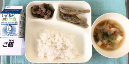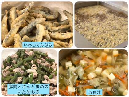 今日の献立は、いわしてんぷら・五目汁・豚肉とさんどまめのいためもの・ごはん・牛乳でした。
