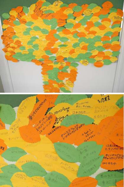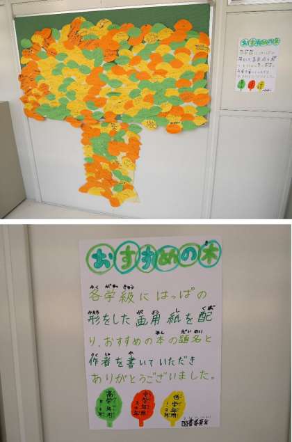 「読書の木」ができました。みんなが読んだおすすめの本を、はっぱの形の画用紙にかいてはりつけました。いろいろなおすすめがありますね。一度よく読んでみてくださいね。