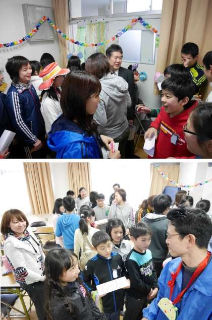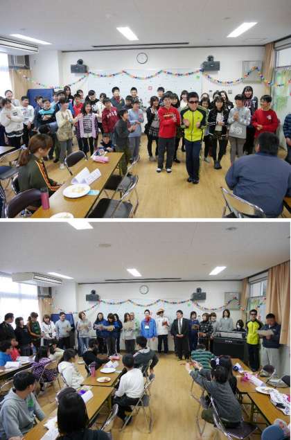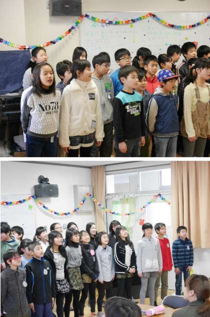 茶話会も最後。子どもたちの歌のお返しに、今度は先生がた全員で歌をうたいました。曲は「夢をあきらめないで」とアンコール曲「なごり雪」です。茶話会が終わって子どもたちが先生たちを見送ってくれました。とてもあたたかい交流がもてて、とてもよかったです。