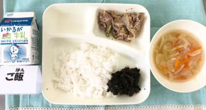 今日の献立は、豚肉のごまみそ焼き・すまし汁・のりのつくだ煮・ごはん・牛乳でした。