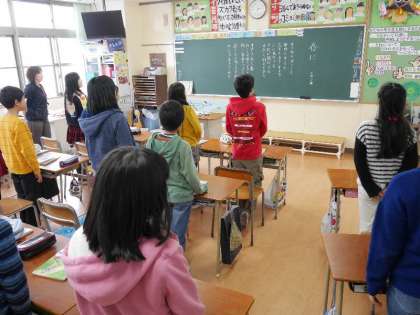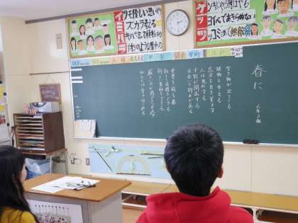 6年生が「春に」を題材として詩をつくっています。みんなで感じた言葉を出し合って完成しました。出来上がった詩をみんなで朗読しています。「出会いと別れ」「私たちは歩きはじめる」未来にむかってはばたけ6年生!