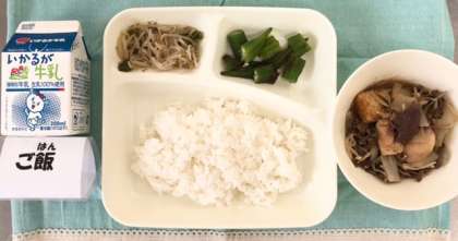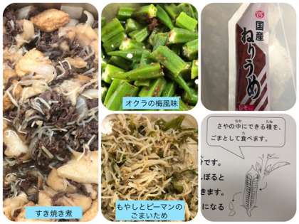 今日の献立は、すき焼き煮・オクラのかつお梅風味・もやしとピーマンのごまいため・ごはん・牛乳でした。