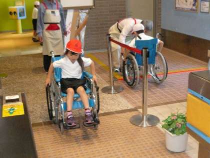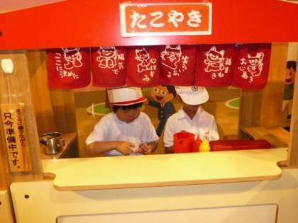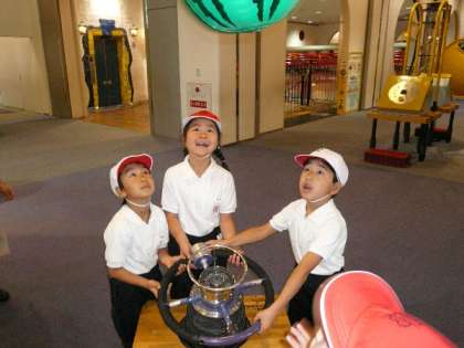 キッズプラザはとても広く、4階と五階のフロアにたくさんのコーナーがあります。フロアの真ん中には階をあがったりおりたりできる階段やつり橋もあります。