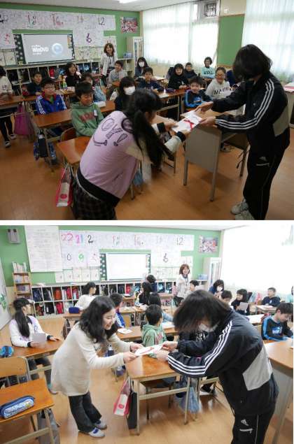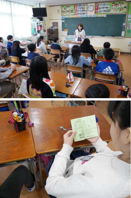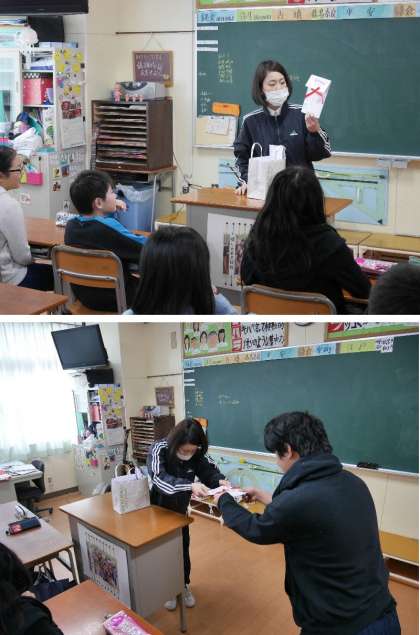 そして今日は、ゲストとして保健室の先生が、6年生の教室に登場しました。保健室の先生からは、6年間の成長の記録をまとめたカードを、一人ひとりに手渡してくれました。カードのネクタイの赤テープは、6年間で成長した身長の長さで飾られています。自分の成長がひと目でわかりますね。