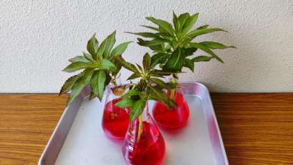 水は透明なので染色液を使いました。2日経てば葉の先まで赤くなりました。