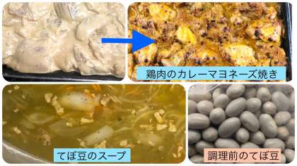 今日の献立は、鶏肉のカレーマヨネーズ焼き・てぼ豆のスープ・さんどまめとコーンのサラダ・黒糖パン・牛乳です。
