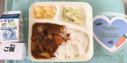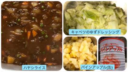 今日の献立は、ハヤシライス・キャベツのゆずドレッシング・パインアップル(缶)・牛乳でした。