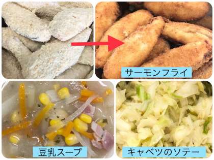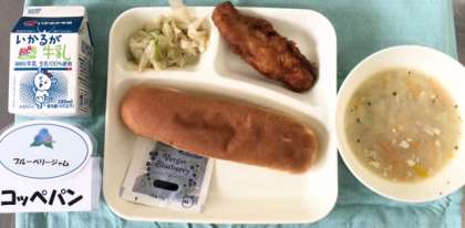 今日の献立は、サーモンフライ・豆乳スープ・キャベツのソテー・コッペパン・ブルーベリージャム・牛乳でした。