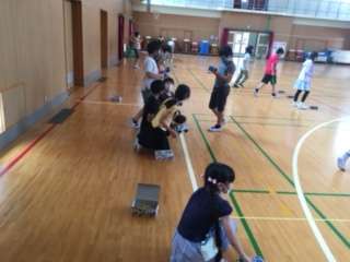 4年生の理科では電気のはたらきの学習をしています。学習したことを確かめるために講堂でモーターカーを走らせました。