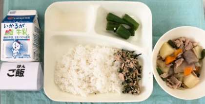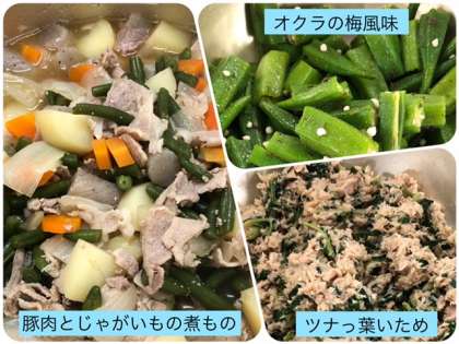 今日の献立は、豚肉とじゃがいもの煮もの・オクラの梅風味・ツナっ葉いため・ごはん・牛乳でした。