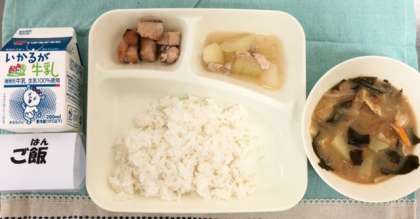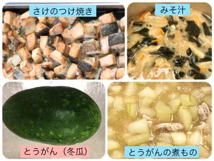 今日の献立は、さけのつけ焼き・みそ汁・とうがんの煮もの・ごはん・牛乳でした。