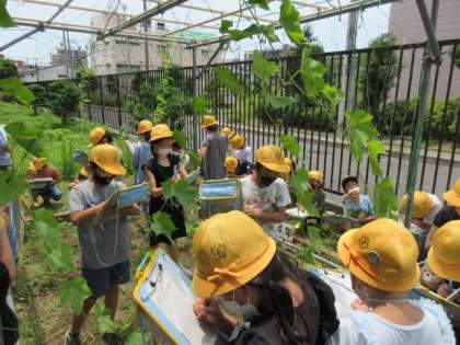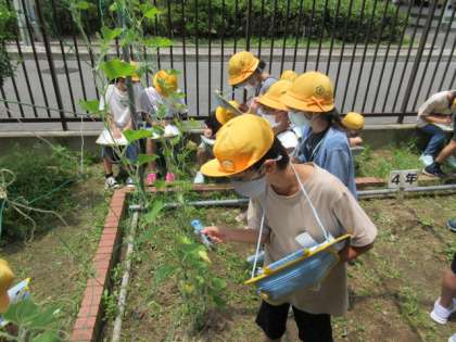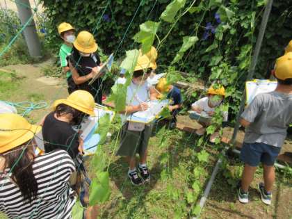 4年生の理科の学習で学習園に行きました。つるの伸びや葉の大きさを定規を使って測ったり、触って手ざわりを確かめたりしながら、熱心に観察をしていました。2学期には実がなっているかな?楽しみです。