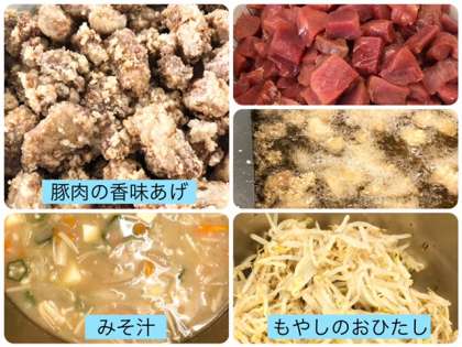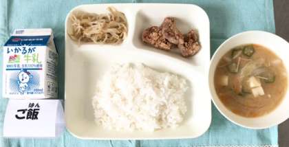 今日の献立は、豚肉の香味揚げ・みそ汁・もやしのおひたし・ごはん・牛乳でした。