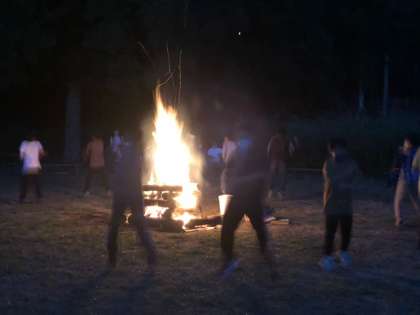 燃えさかる炎を囲み、みんなの仲を深めました。