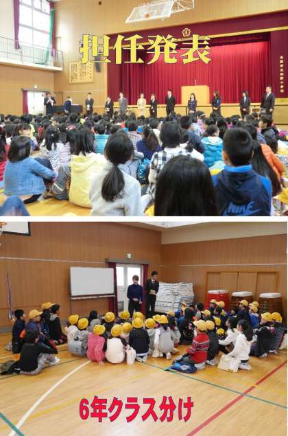 始業式で校長先生のお話のあと、校長先生から担任の先生の発表がありました。みんなの緊張がたかまります。拝んでいる人までいてます。