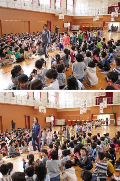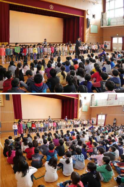 今日の1時間目は、新1年生と2年〜6年生までの上級生とがはじめて顔あわせをしました。大きな拍手のなかを新1年生が担任の先生を先頭に入場です。校長先生のお話のあと、6年生の代表児童が歓迎の言葉をやさしく言ってくれました。