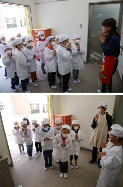 2年生から4年生の給食係が、給食を取りに来ました。感謝をこめて「いただきます。」
