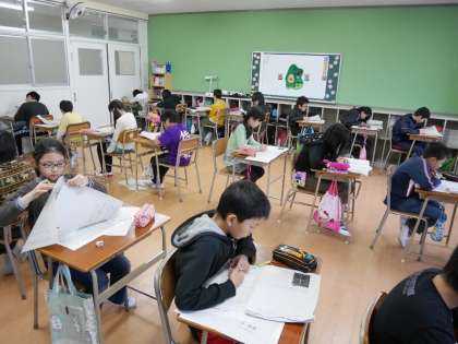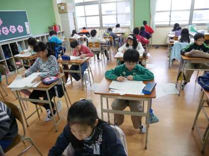 授業の初日からテストです。21日にある全国学力テストにむけて、昨年の学力テストをしています。なかなかむずかしいですね。がんばってくださいね。
