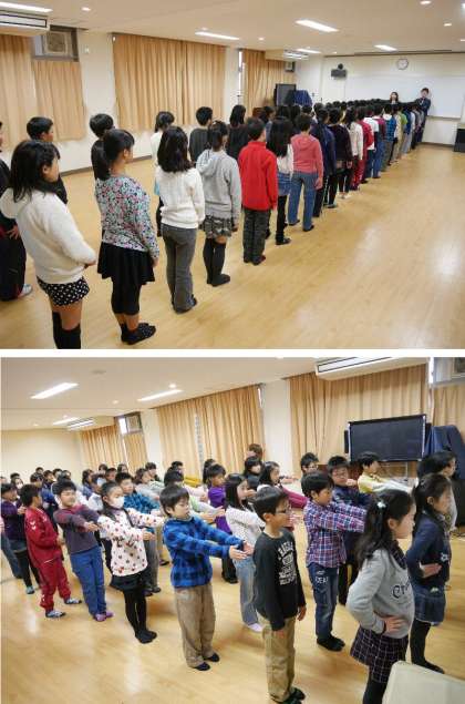 6年生の学年集会がもたれていました。まず、発育測定も終わったので、身長順の整列を確認ましした。2列から4列へもスムーズです。校外学習などで整列する隊形ですね。