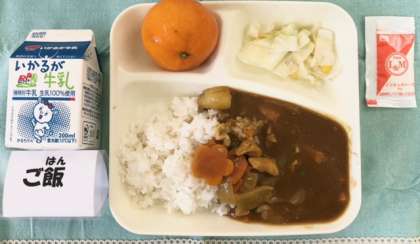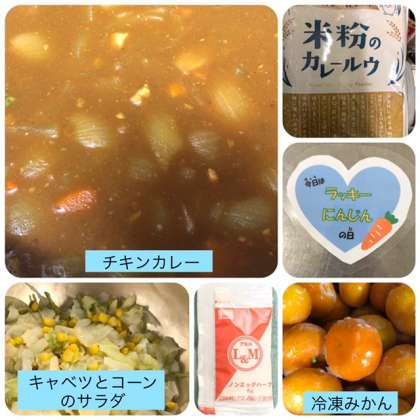 今日の献立は、チキンカレーライス[米粉]・キャベツとコーンのサラダ[ノンエッグドレッシング]・冷凍みかんでした。