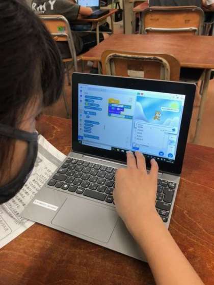 2組では、プログラミング学習をしました。「学習できるゲームをプログラミングしよう」を目標に、質問と回答する仕組みを考えました。一人一人がどのようにすればよいか、思考を凝らしていました。
