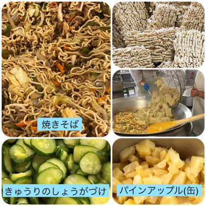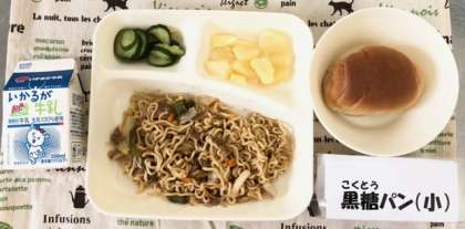 今日の献立は、焼きそば・きゅうりのしょうがづけ・パインアップル(カット)缶・黒糖パン(1/2)・牛乳でした。
