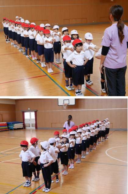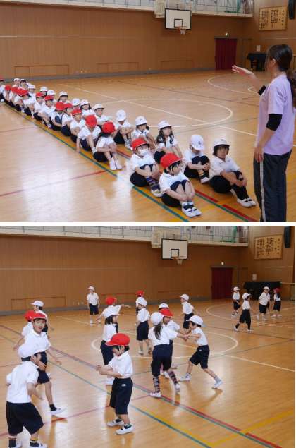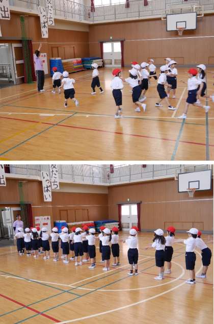 1年生の体育を体育館でがんばっていました。最初は集合と整列の練習です。これからの学校生活でとても大切な動きですね。遠足にいくときも大切です。がんばって集中してほしいです。