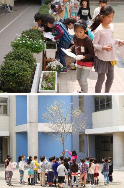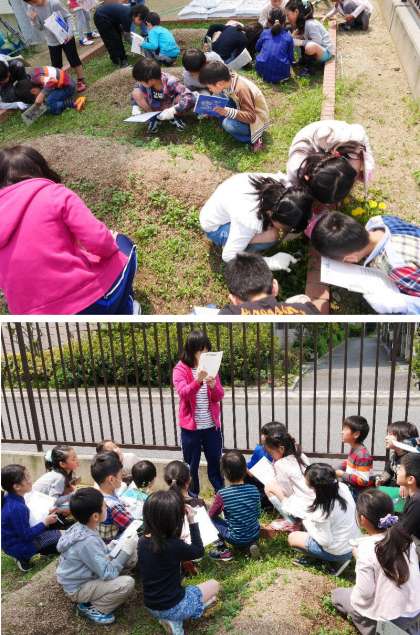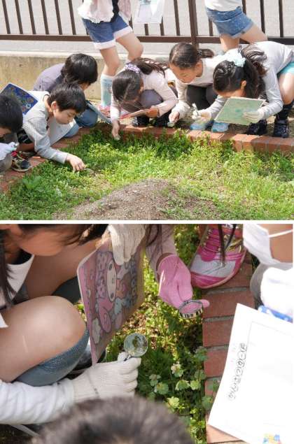 3年生が中庭や学習園で草花をしらべています。ホトケノザなどを虫眼鏡で観察しています。ひさびさの天気で春を感じられきもちいいですね。