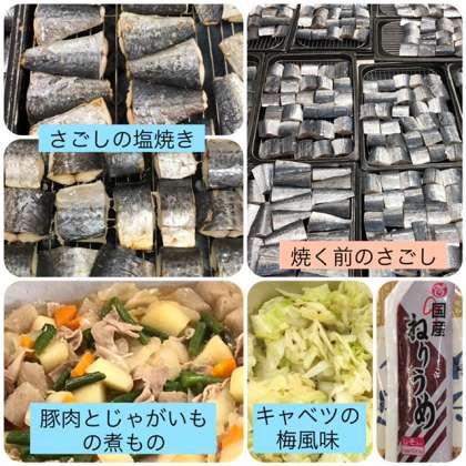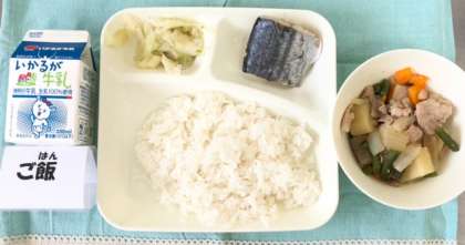 今日の献立は、さごしの塩焼き・豚肉とじゃがいもの煮もの・キャベツの梅風味・ごはん・牛乳でした。