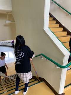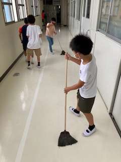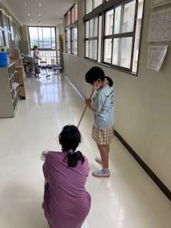 道徳の学習で、自発的に公園のそうじを行うエピソードから、働いてみんなの役に立つ気持ちよさを考えました。その後、校内の廊下や階段などのそうじに取り組みました。