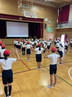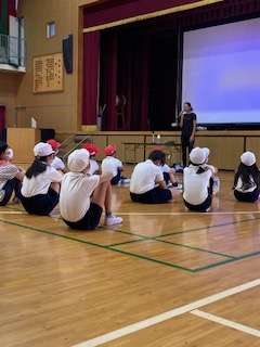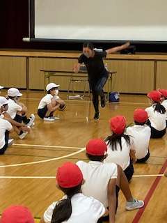 陸上を始められたきっかけのお話を聞いた後、まず、肩甲骨を意識したストレッチと、体の軸を意識したスタートを教えていただきました。その後、運動場に出て、スタートからの走り出し、スピードにのってからの走り方を教えていただきました。「スタート後は軸を立てて、しっかり地面をけって!」「スピードにのったら、かかとをおしりにつけて走って!」の2つのポイントを意識して子ども達は練習をしました。最後にまとめとして、学年4チームに分かれ、リレーを行いました。
