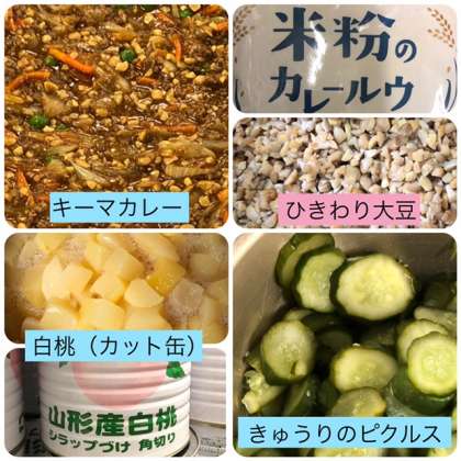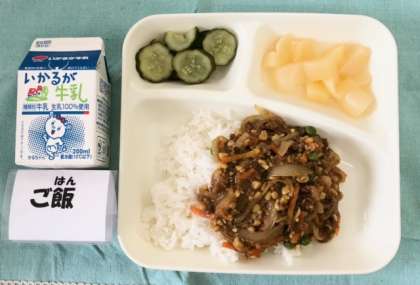 今日の献立は、大豆入りキーマカレーライス[米粉]・きゅうりのピクルス・白桃(カット缶)・牛乳でした。