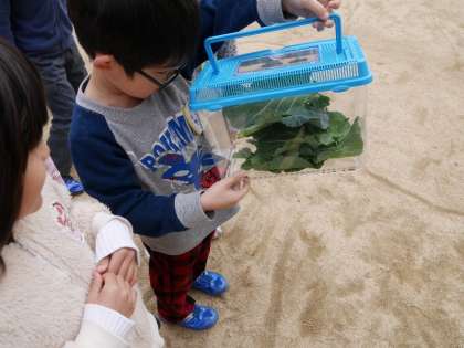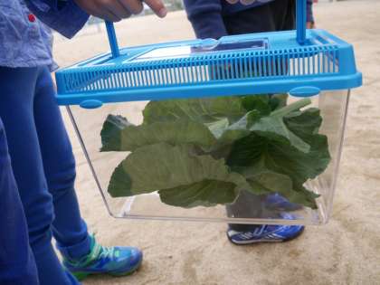 学習園のキャベツにちょうちょの卵をみつけました。葉ごととってカゴにいれました。うまくかえるかな。