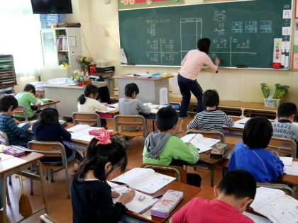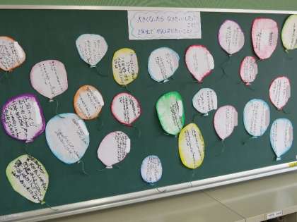 教室のうしろには「大きくなったら、なりたいこと、したいこと」のカードがはられていました。「給食を残さずたべる」「計算がはやくできる」「姿勢を正しくできる」「九九をできるよう」など、がんばる気持ちがあふれていました。