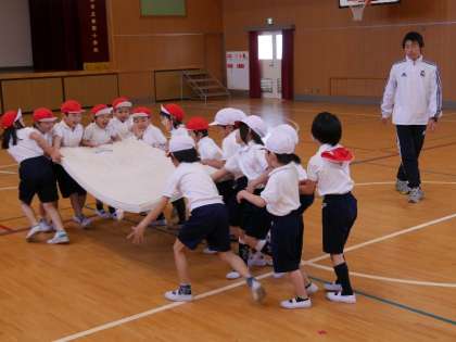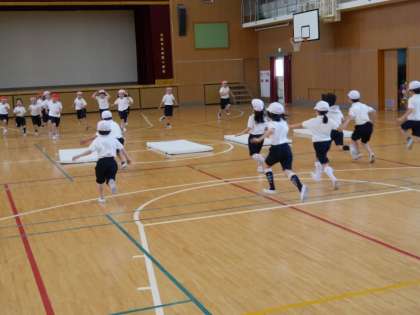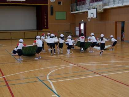 体育館では2年生の体育です。紅組と白組に分かれて、マットをひっぱって自分の陣地にもっていきます。元気いっぱい運動する2年生でした。