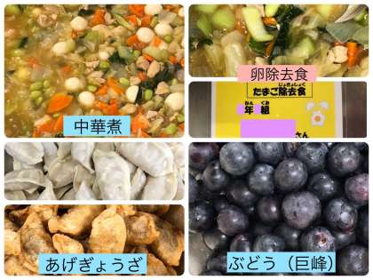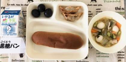 今日の献立は、あげぎょうざ・中華煮・ぶどう(巨峰)・黒糖パン・牛乳でした。