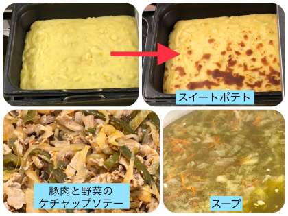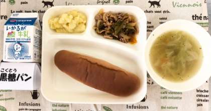 今日の献立は、豚肉と野菜のケチャップソテー・スープ・スイートポテト・黒糖パン・牛乳でした。