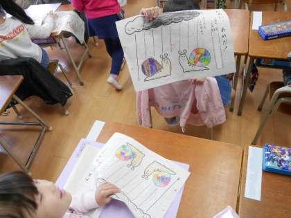 1年生が「わぁい、あめだ!」ら雨を書いて色をぬりました。とてもカラフルなかたつむりさんですね。