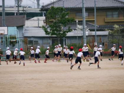 雨多し、ようやく運動場で体育の授業する4年生