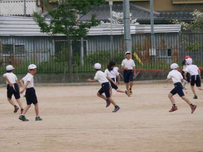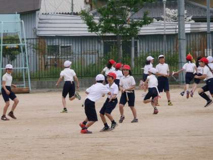 雨があがって、4年生が運動場で体育の授業です。しっぽとりでみんなで楽しく走り回っていました。