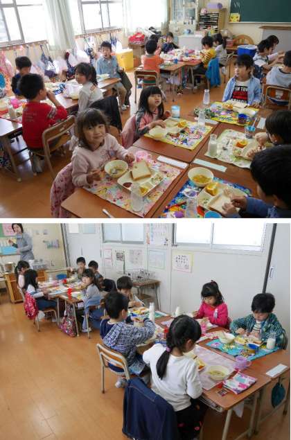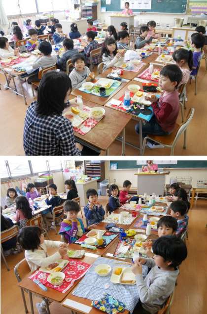 1年生が元気よく給食をたべています。毎日とてもおいしいです。今週金曜日には給食参観があります。ぜひご来校いただき、子どもたちの様子をご覧ください。