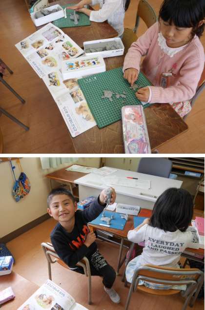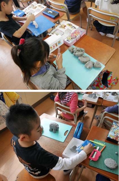 2年生がねんどで動物をつくっています。像や亀、ライオンなど、いろいろな動物楽しそうにつくっています。