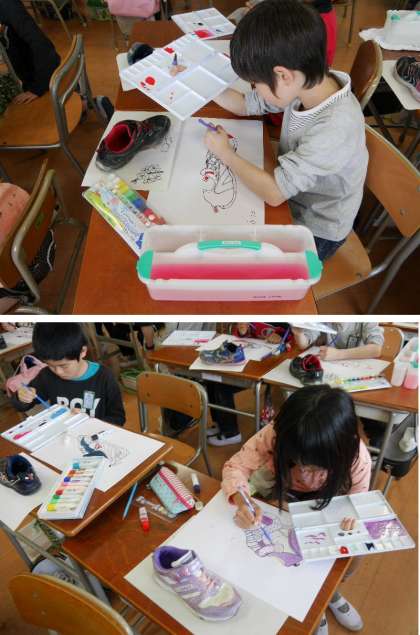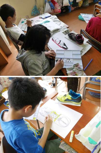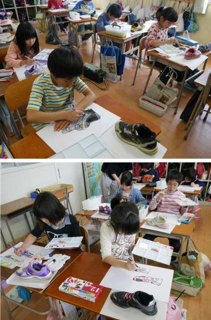 4年生が自分のはいている靴を絵具でリアルに描いています。さすがは4年生です。とても上手です。