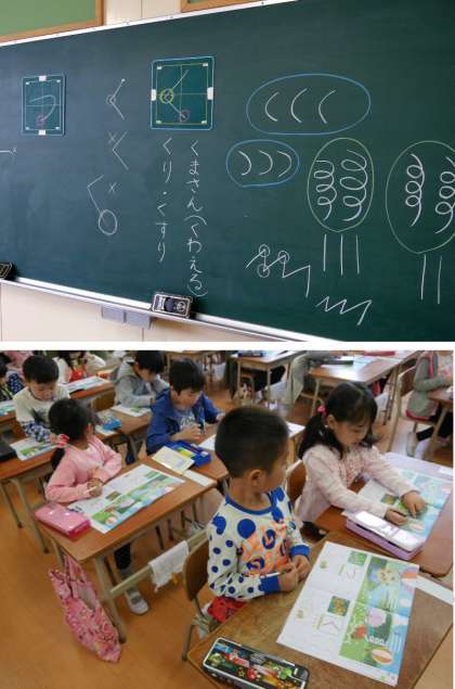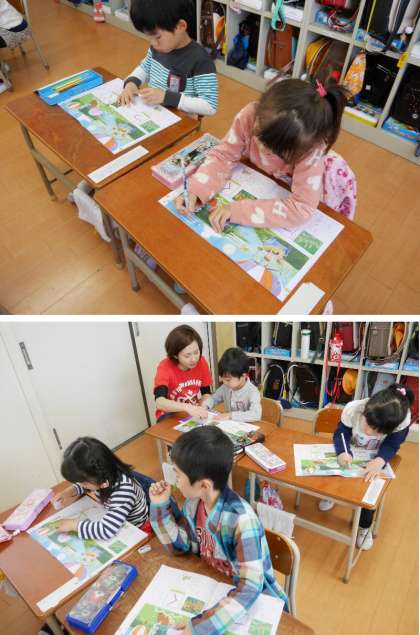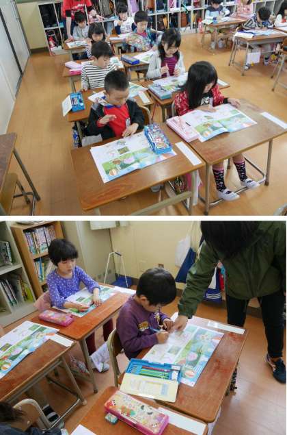 1年生がひらがなの練習をしています。上手に鉛筆がつかえるよにがんばっています。